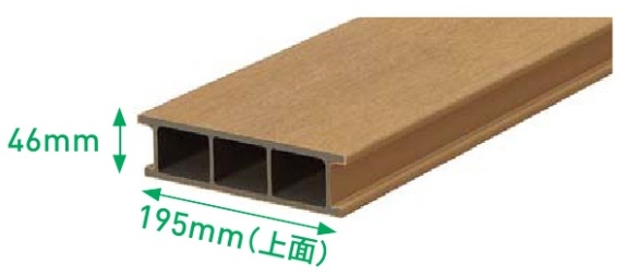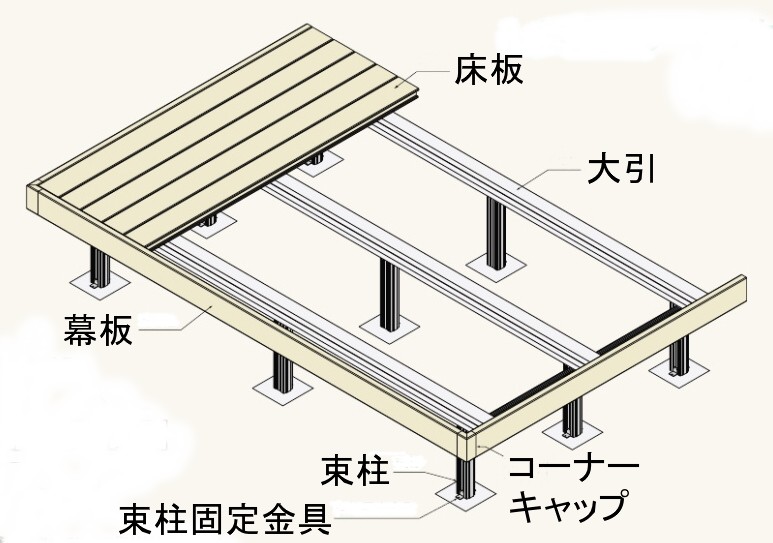 色は次の3色です。 どの色がお好みですか? ![]() 板の厚みはデッキ選びのポイントになります。 これだけ厚いと、簡単にたわみません。 ![]() <デッキの基本構造> 床下の大引・束柱は、アルミ製ですので、腐る心配がありません。 ![]() デッキ床の表面に、取り付けネジが見えてこない設計になっています。 |