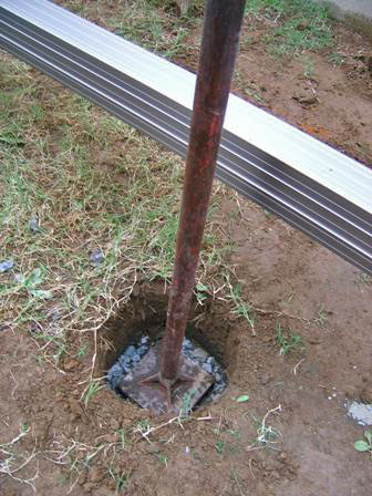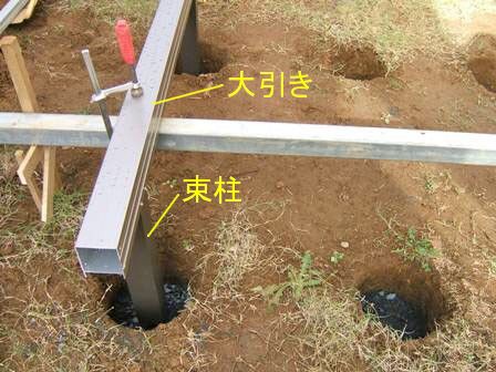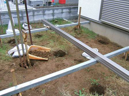 ![]() 地面の掘削状況。左右に渡した四角い鉄パイプは、所定の高さに正確にそして水平に固定されています。これで穴の深さも測れるわけです。 |
