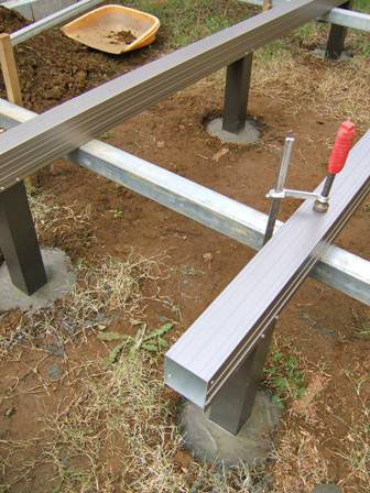 ![]() アルミの大引と束柱を正確な位置に仮固定。 束柱は、メーカー規定品よりも長めのものを使用し(値段は短いものと同じにしています)、地面に食い込む形にしています。柱が地面から生えているようにしっかりしているので、ルート基礎工法と呼んでいます。 一般的な施工では、コンクリート板の上に柱を乗せるのですが、板そのものが沈み込んだり傾いたりすると、デッキにも歪みやきしみが発生してしまいます。 |