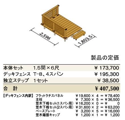左のフェンスは、フラットラチスパネルT-8(高さが80cm)のもので計算しています。 (この他に、T-6、T-10、T-12の規格のものもございます) ●デッキ レストステージ 横1.5間、縦6尺 定価178,960(幕板仕様)×55%=98,428 ※左図の本体セット定価は、床板キャップ仕様の場合です 施工 50,110 合計 148,538 ●階段 定価38,500×55%=21,175 施工 10,780 合計 31,955 ●フェンス フラットラチスパネル T-8 定価195,300×55%=107,415 施工 39,500 合計 146,915 セット完成価格 327,408 (消費税は別途になります) |