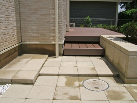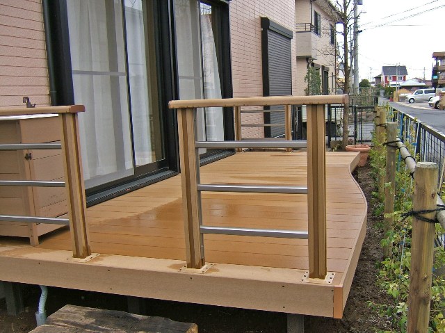 S邸 茨城県牛久市 大きな曲線で縁取られたデッキ。 階段もそれに合わせてカーブしています。このようなオリジナルな階段が、庭を個性的にしていますね。 右側のフェンスは背が高いので、型枠ブロックという幅広の特殊なブロックに差し込んでいます。デッキに依存しないので、ビクともしません。 上にはテラス屋根も設置しました。 |