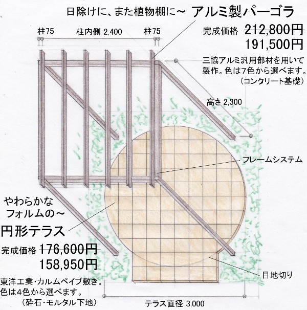 この図面は、一つのサンプルです。サイズと価格を、明記しておりますので、ご参考になさっててください。 庭の状況に応じて、自由にデザインすることが可能です。ご相談ください。 他のあらゆる素材にも、対応いたしております。 値引き価格は、キヤンペーン中のもので、それ以外のときは、通常価格に戻ります。 |