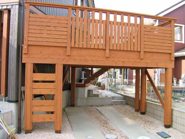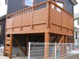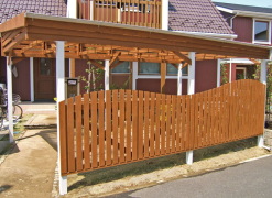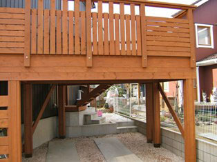 駐車場の上部にウッドデッキを作りたいというご希望でした。一見オールウッドに見えますが、安全性と耐久性を考えて、柱は大口径のアルミ角材を使用。それをウッドでカモフラージュしています。上部は完全なウッドデッキになっています。 | 千葉県 千葉ニュータウン 印旛村 2010 |