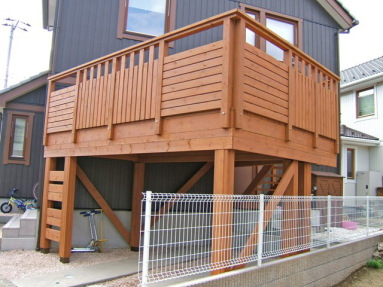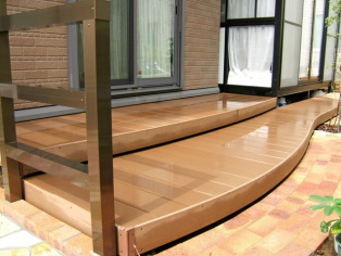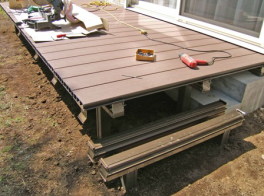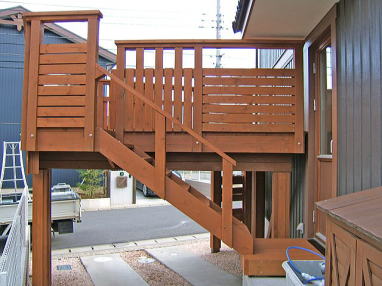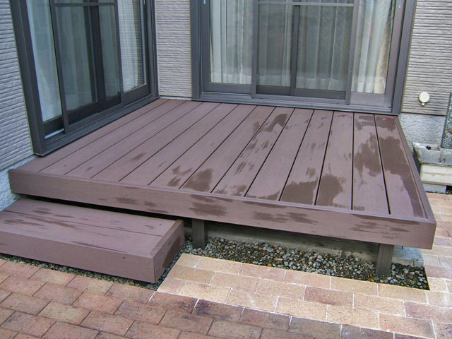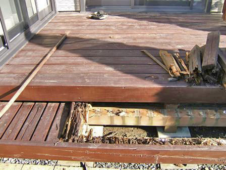 | デッキ交換 | 古いウッドデッキが、続々と造り替えの時期を迎えています。鉄のネジを用いたデッキは、腐るのが速いようです。屋外のウッドには必ずステンレスのネジを使いましょう。最近は腐らない人工木材のデッキが主流になっています。 | 千葉県 成田市 2011 |