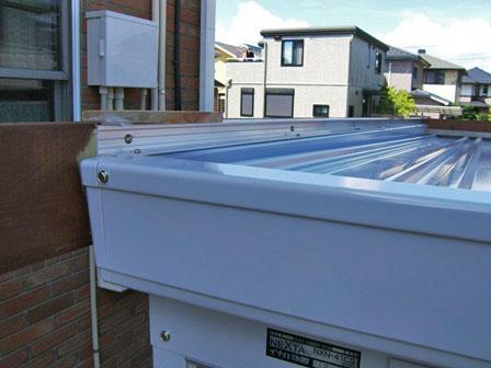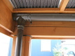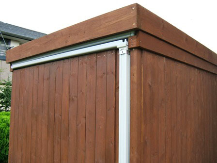 床下には雨除けパネルが張られている(上)。水を集める雨樋(左)。 | ||