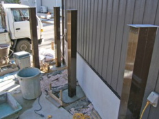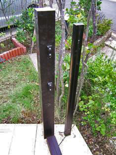![]() 新しい太い柱(左)を、古い柱(右)にすっぽり被せて固定することに。 |