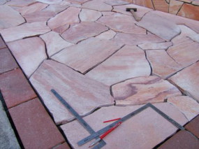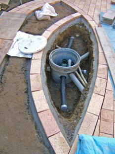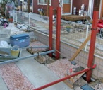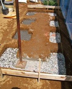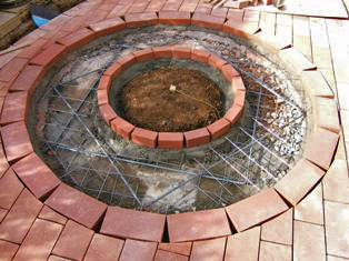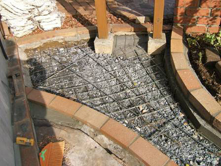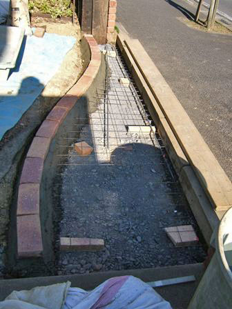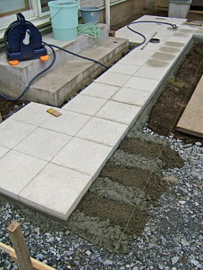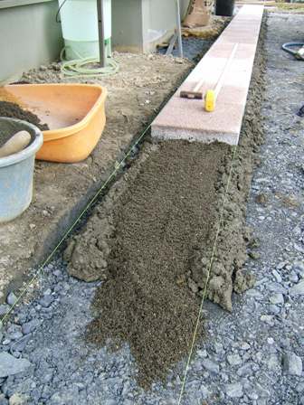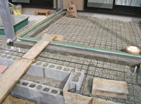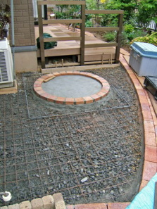 ![]() 石貼り部分の下地作業。 砕石を敷き転圧をかけ、メッシュや鉄筋を配置した後、下地コンクリートを流すところ。 その上にモルタルで石を張っていく。 |