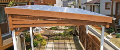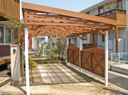 冷たくなりがちなカーポートをウッドで作り付けてみました。建物や周りの風景とも溶け合い、ガーデンの中でのひとつの構成要素にもなっています。柱は前出の「スカイデッキ」と同様アルミを用い、耐久性の向上を計っています。 | 千葉県 千葉ニュータウン 印旛地区 2009 |