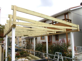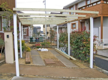 ![]() 工事中の様子。パーゴラとしてだけならこれだけでも充分だろう。 |