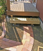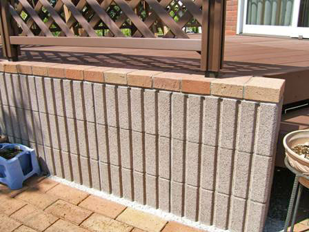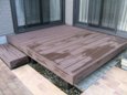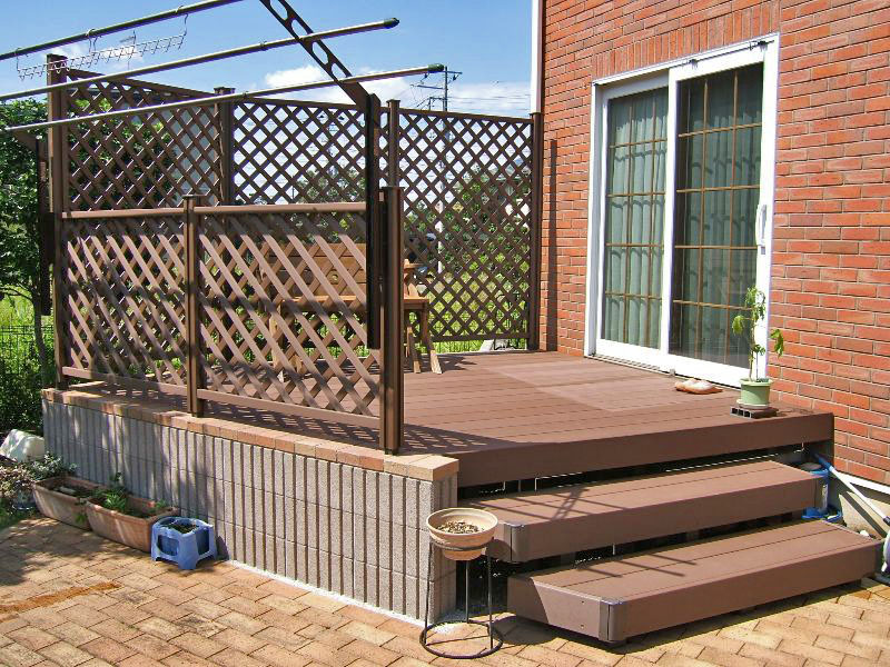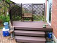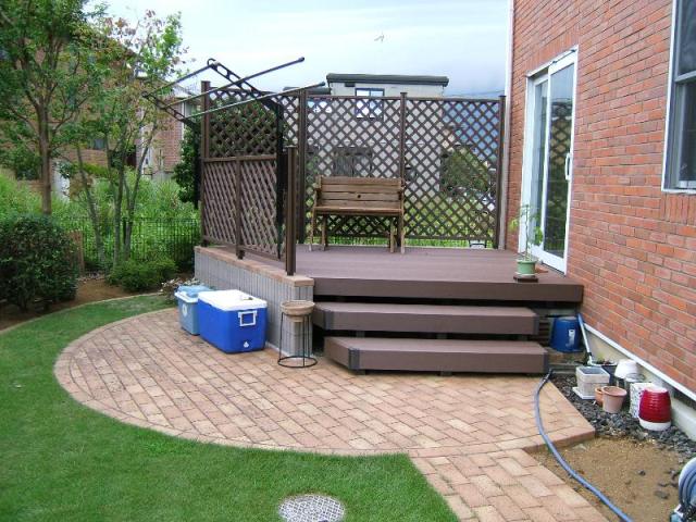 完成した人工木材デッキ。 もう腐る心配がない。 LIXIL(TOEX)社製。 デッキ下のレンガ貼りも、今回手直しした。 きめの細かいリフォームになっている。 |