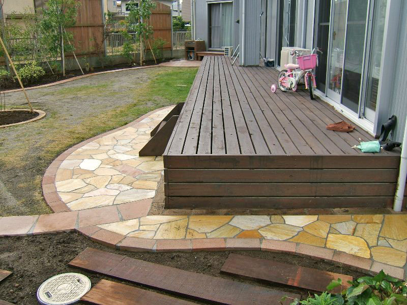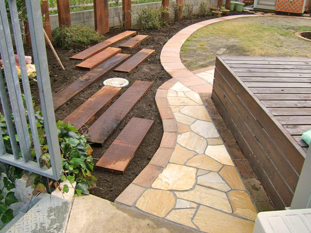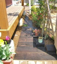 ![]() パーゴラから続く動入路。 ![]() デッキに階段を作り、動線を導く。 ![]() デッキ前の小スペースも枕木でおしやれにアレンジ。 |