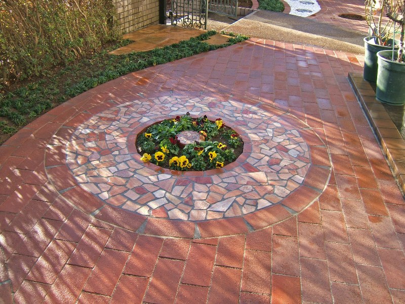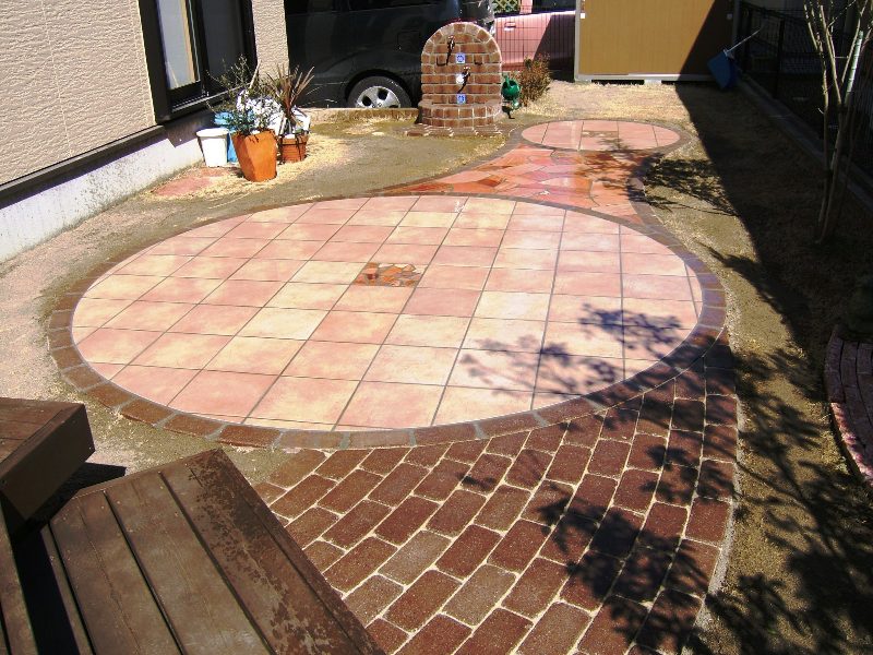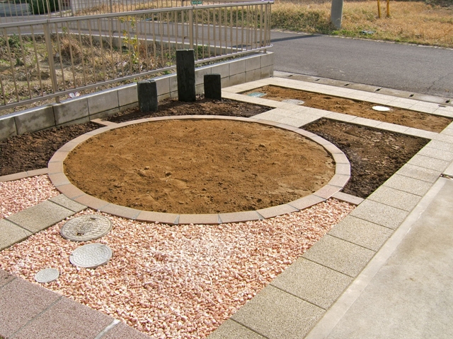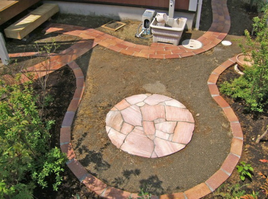 ![]() 石貼りをした中央のサークルがアクセントになって、このガーデンの個性が演出されている。 |