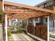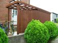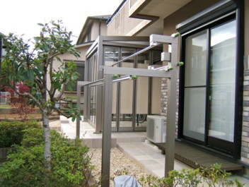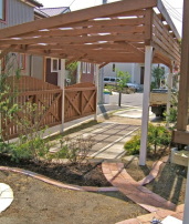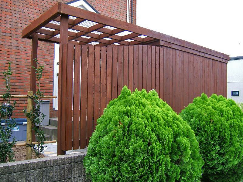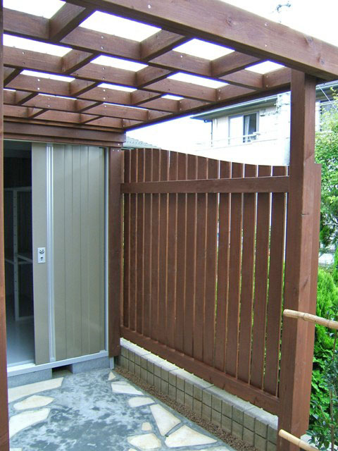 ![]() 編みこまれたパーゴラ屋根から陽光が漏れる。柱の白は、建物(左側)の窓枠の白色にあえて合わせたものである。この奥に今回、小庭も作っている。 |