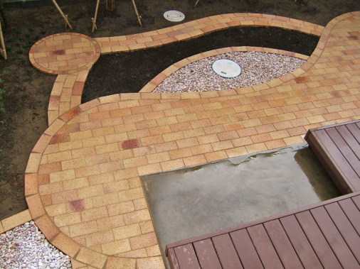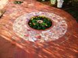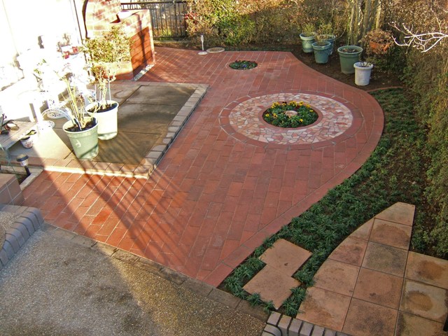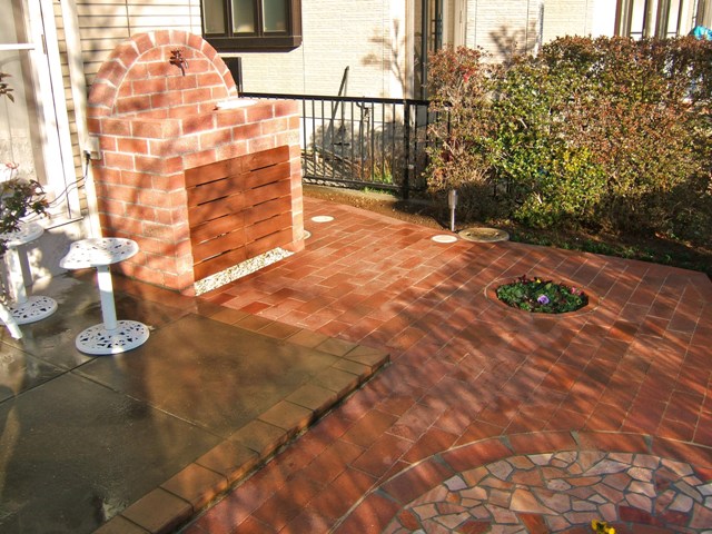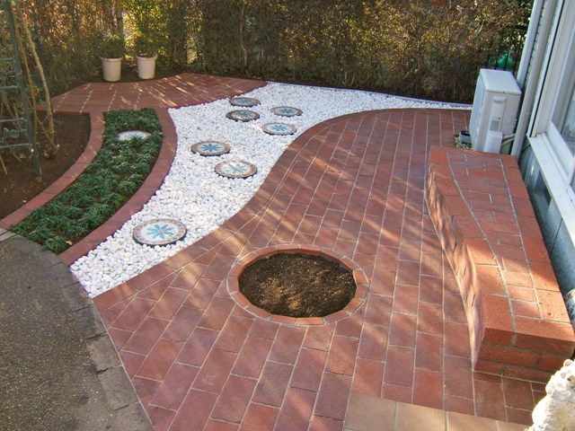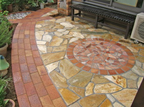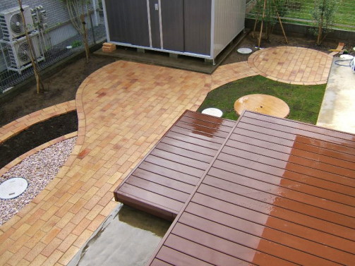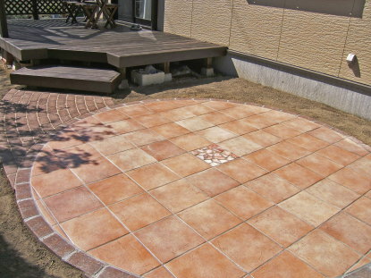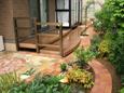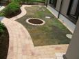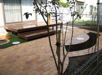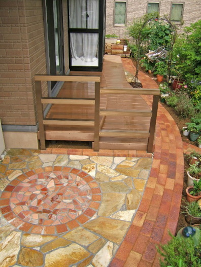 ![]() 2段構えのデッキ(人工木材製)に沿ってレンガ敷きの園路がとられ、それが庭全体を縦断するメインの動線となって伸びている。アクセントで設けた円の内側は、色違いの石をモザイク状に貼り密度の高い空間としている。 |