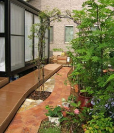![]() 和室前の景。濡れ縁をやめてレンガづくりのステップに。庭の奥もデッドスペースにならないように小コーナーとした。 |