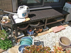 ![]() 左手前の格子は、手すりを兼ねたハンギング用のフェンス。アルミ角材を組み上げたものである。 |