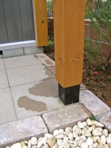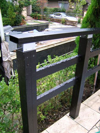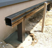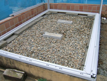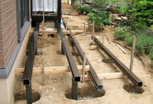 ![]() アルミの土台を設置する。テラスの上は柱を金具止め。それ以外の柱はコンクリートでしっかり固定。 |