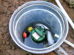 ![]() 中に仕込まれた水中ポンプで、水を強制排水。これは技術系のご主人のアイディアであり、オークションで入手されたものだという。水位が上がるとウキによってモーターのスイッチが入る仕組み。(試験中の状況) |
