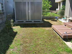 ![]() 着工前の状況。 デッキと物置だけが置かれている。さて、どうしたものか。 できるだけ手間がかからないスッキリした庭をご希望との事であった。 水はけの改善も大きな課題であった。 |