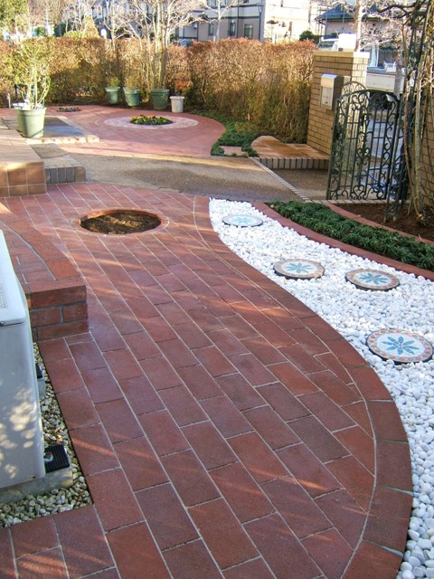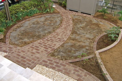 ![]() 大きな曲線が、一筆書きのように向こうまでつながっていて心地よい。 丸い飛び石は、既存のものを再利用した。白い玉砂利はお客様のご希望によるもの。レンガとのコントラストが際立っている。 |