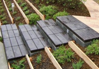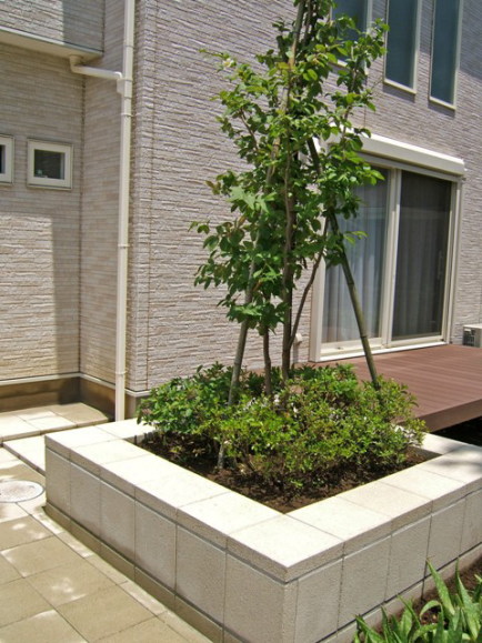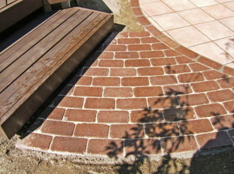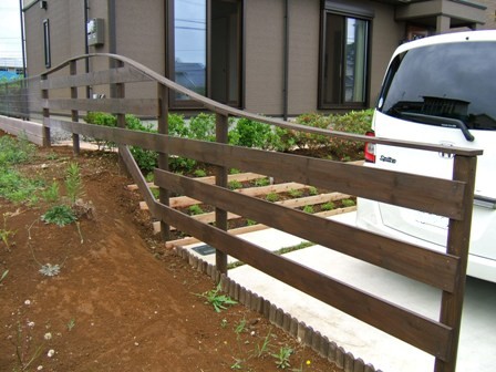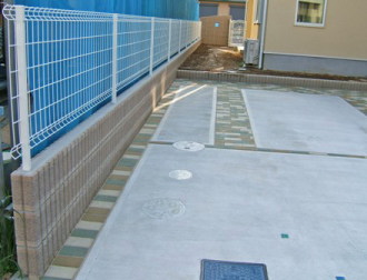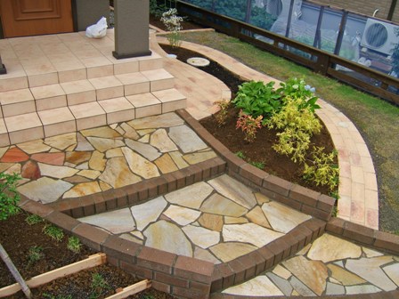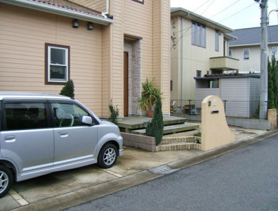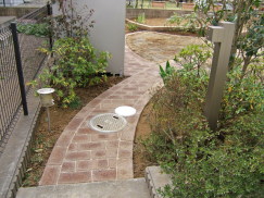 ![]() 駐車場との境のブロックを一部はずして、出入りのしやすいスロープに。両側に花壇も設けた。 |