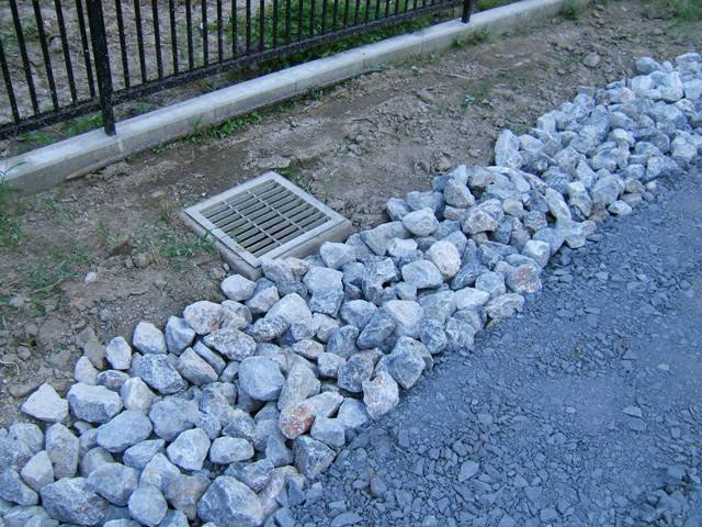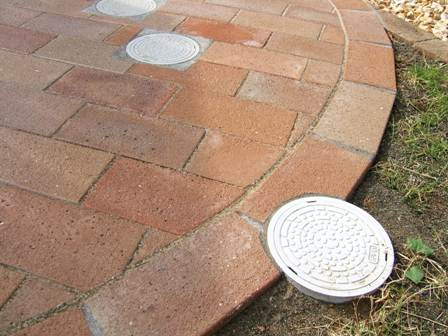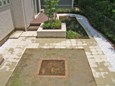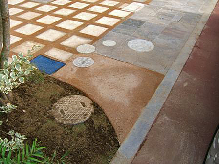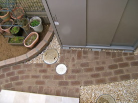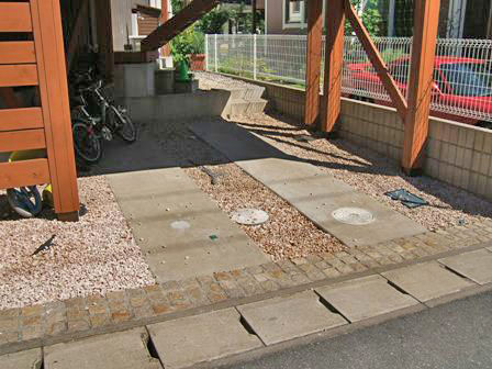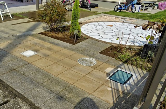 ![]() 砂利の中に見える白いフタのマスが、実はこの庭の要。庭に降った雨の全てがここに集められる。 |