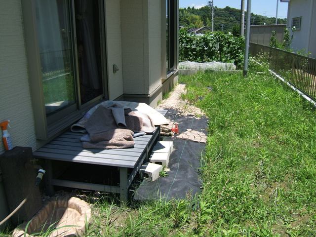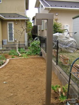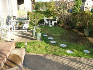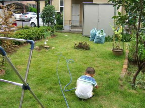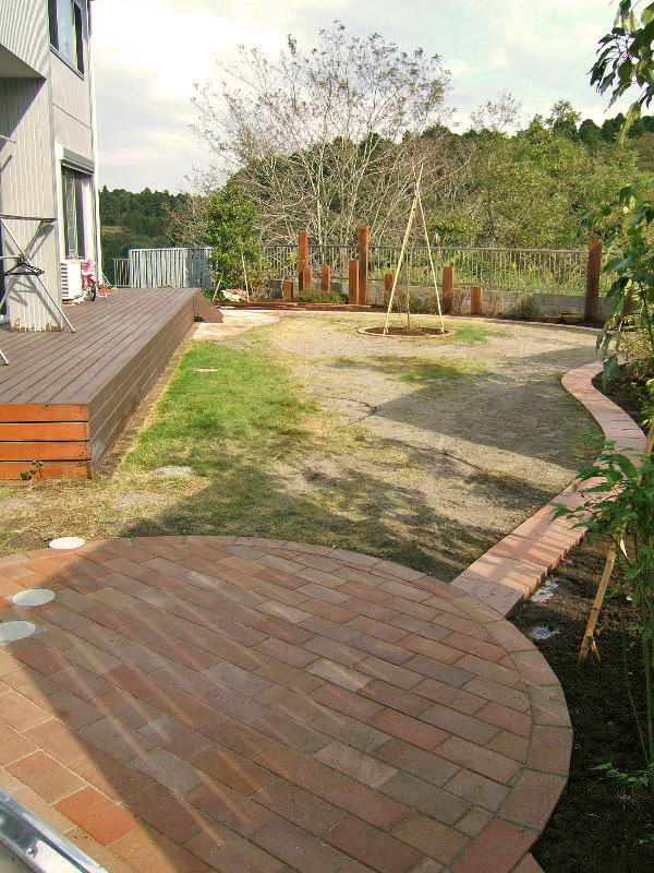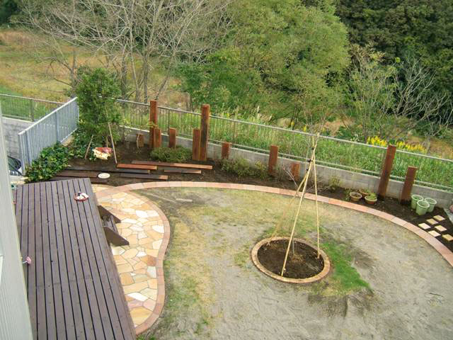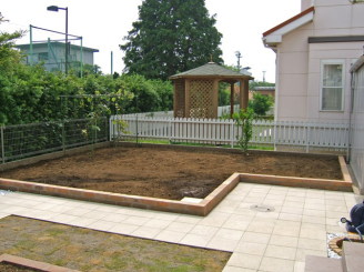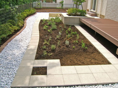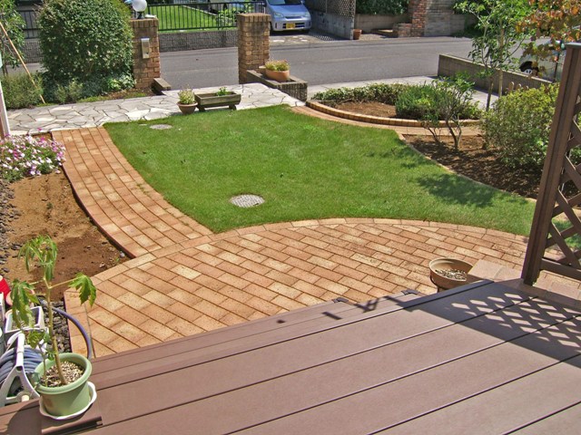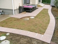 | 建売住宅の出来合いの庭がどうにもお好きになれず、何とかしたいというお客様のご希望であった。(右写真) まず庭の各所を動線でつなぐことから始めた(とくにデッキ、水道等使いやすく)。次にレンガの縁取りを曲線状にまわすことで、芝生とその周りの土の部分とに区分けした。土の部分はお好みのハーブ等を植え込んでいくことで、草花に囲まれた楽しい庭になっていく予定である。(上写真) |