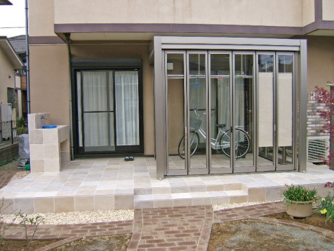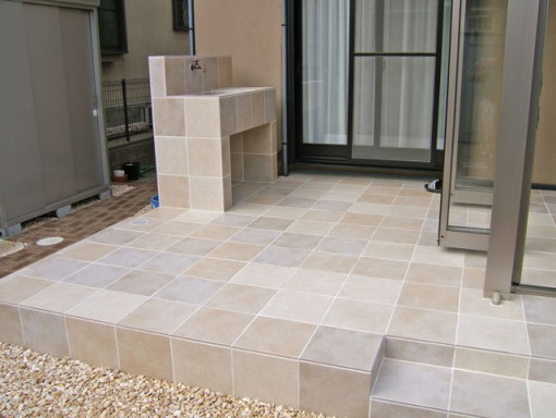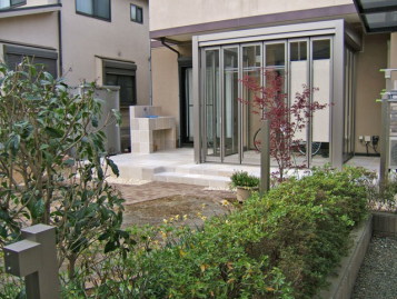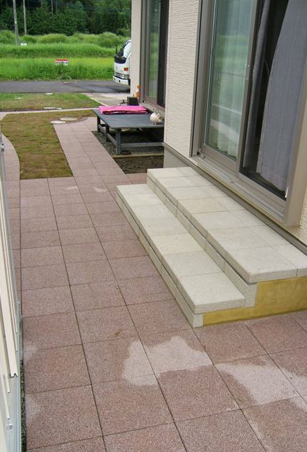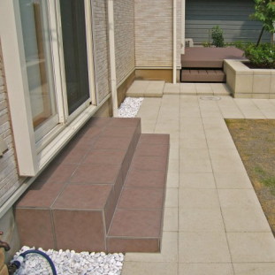 ![]() 居間の延長としてのテラス。 平板は、透水性を持つ製品を使用した。 階段の平板は、側面も仕上げがなされた階段専用のものだ。 |