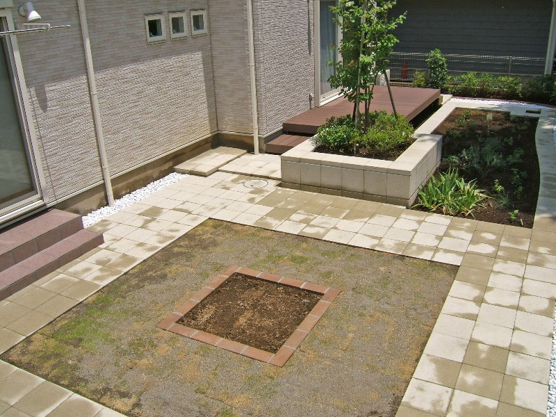 ![]() 30cm×30cmの平板を組み合わせ、庭の骨格となる部分が完成。 居間前にテラスを確保し、それにつながる動線を、ゆるやかな曲線を用いて大胆に描いた。 芝生はフレームの中に収め、その外側に若干の植栽をほどこした。 物置もその中に組み入れた。 |