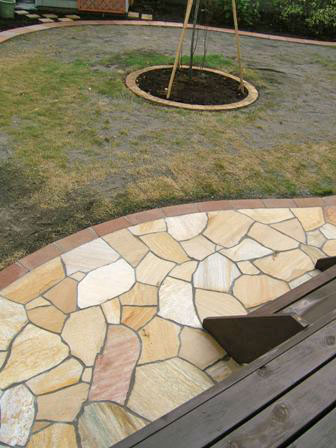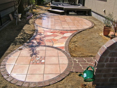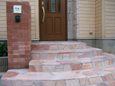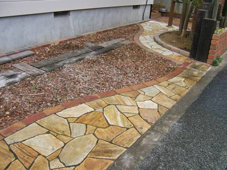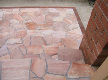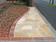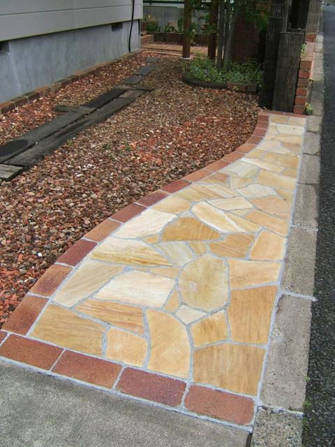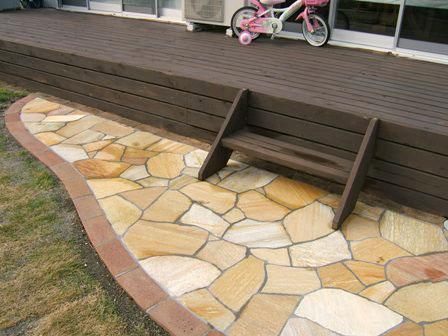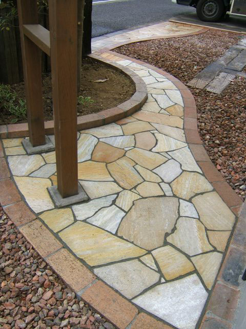 ![]() 石貼りに使われている石はもともと庭に使われていたものを再利用したものである。工事前にご主人が高圧洗浄機できれいにして下さっていた。 園路は玄関方面へと導かれる。 |