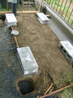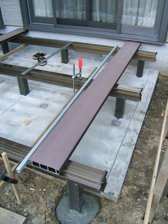 工事中![]() デッキを支えるアルミ構造体を正確に配置。 ![]() 足元をコンクリートで固める。 |