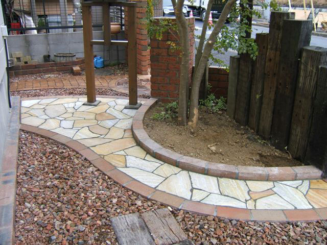 歩道に面した駐車場の小リフォームです。既存の枕木が痛んできたため、自然石を乱貼りとし、レンガで縁取りをしました。このお客様のところでの第6期工事になります(第1期は庭)。その後の第7期工事と合わせてご覧下さい。 | 千葉県 酒々井町 2011,2015 |