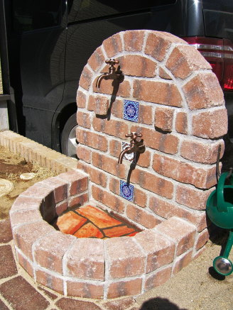![]() おしゃれな水道。建物際のレンガは芝生を刈りやすくするための縁取り。 |