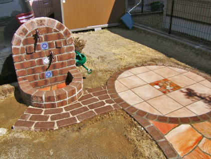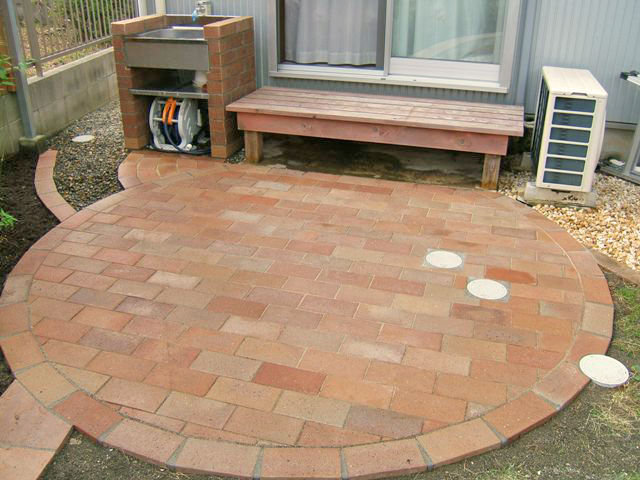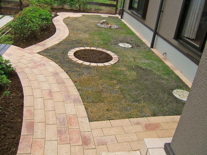 芝生の庭を本格的にリフォームしました。長年手入れを続けてきた芝生でしたが、もう大変なので、できるだけ手間のかからない庭にして欲しいとのご依頼。大面積をレンガで覆い、所々丸く刳り抜いてアクセントの花壇としました。立って使える水道も喜んでいただきました。 |