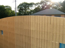 ![]() 遊歩道に面した側に作られたフェンスは上面が曲線に。フェンス全体で柱の補強材にもなっている。 |