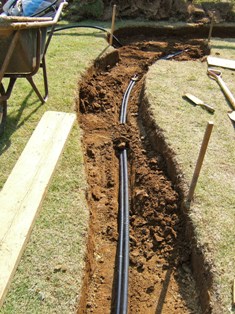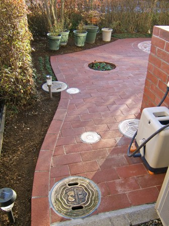 ![]() 電気配線のためのフレキ管。園路の真下に埋設した。 |