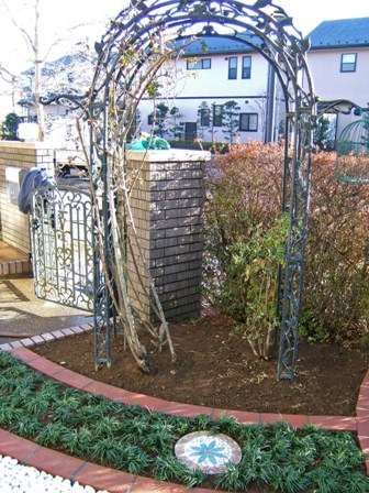 ![]() 門近くにある薔薇のアーチ。 薔薇はプランターに入っていたものを地植えし直した。 |