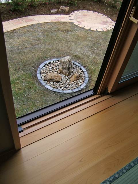 ![]() 和室の前にミニ和風庭園が。黒い瓦調のレンガで縁取り、大中小の三石で枯山水とした。 |