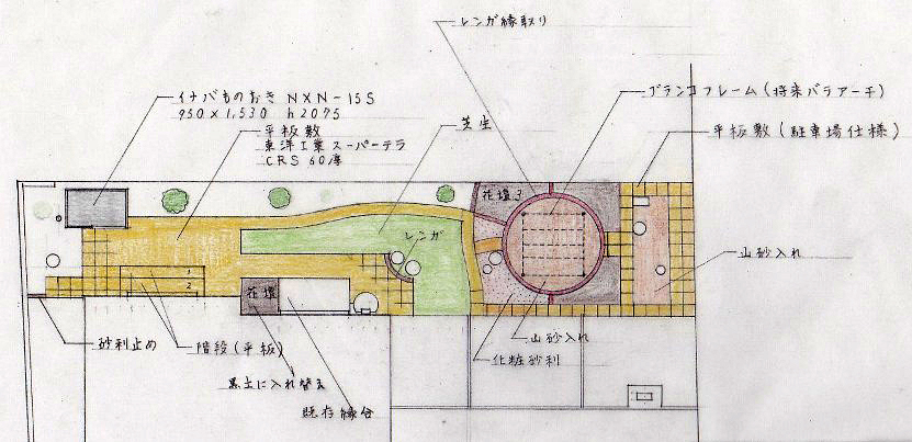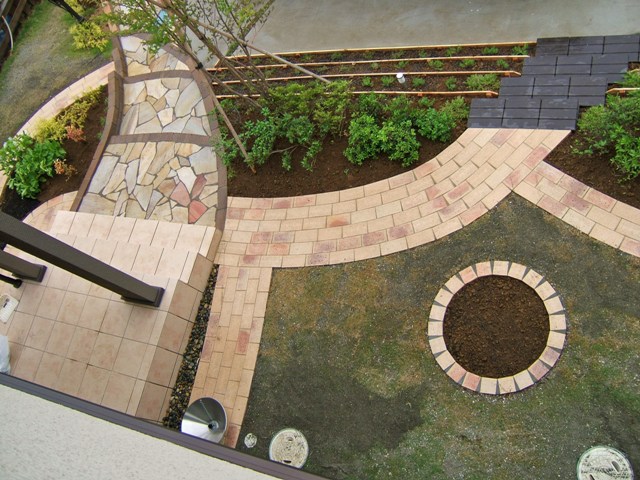 ![]() このあたりに花壇が欲しいというご希望であったが、動線を一巡りさせる事でそのスペースを確保。こうすることで庭が広く使えデッドスペースが少なくなる。 |