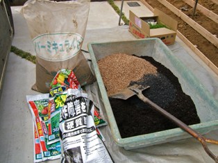 ![]() ガーデニングは土作りから。肥料と土壌改良材の混合。 |