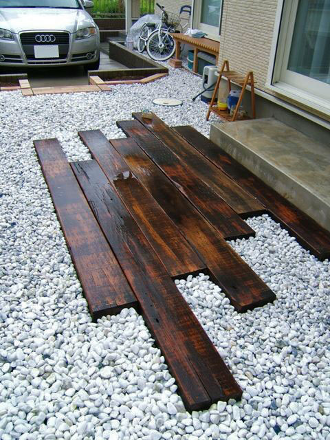 草取りをしなくて良いように、白い砂利を敷きつめて欲しいとのことでした。デザイン上、居間の前に、枕木をアクセントになるよう敷き並べました。その色の対比が際立っています。 | 千葉県 成田市 2013 |