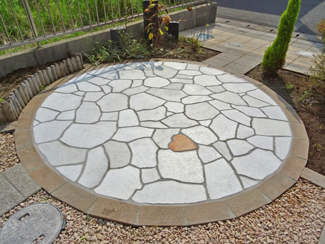 円内は、草取りが大変なので、結局、石貼りとすることに。 白の中に、ピンクのハートでアクセントに。 |