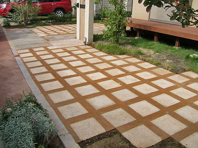 実はこの駐車場は、ご相談を受けた時、石(御影石)のすき間に芝生が植えられていました。段差ができて歩きにくいのと、手間がかかりすぎるので、リフォームして欲しいとのこと。固まる土を用いてフラットに仕上げました。 このようなすき間を埋めて欲しいという依頼は結構多いものです。 |