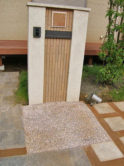 門前の植栽スペースも、使いにくいとのことでフラットに。化粧砂利が浮き出る仕上げ(洗い出し)で、ワンポイントとした。 |