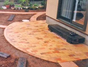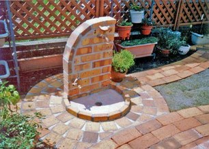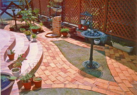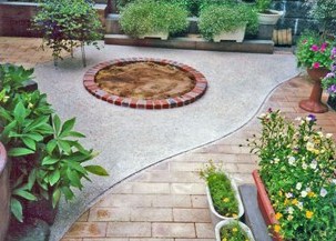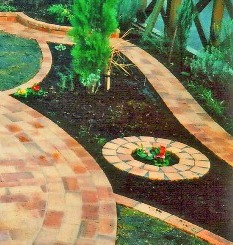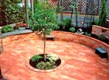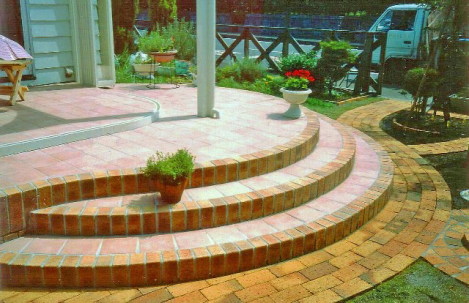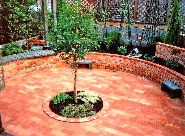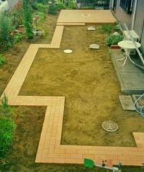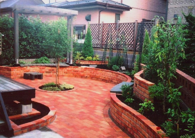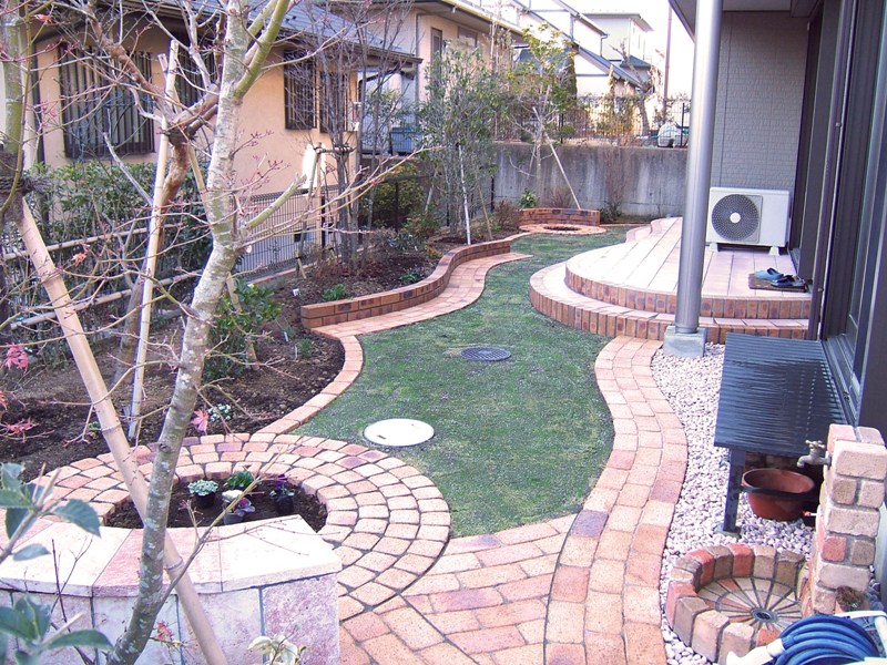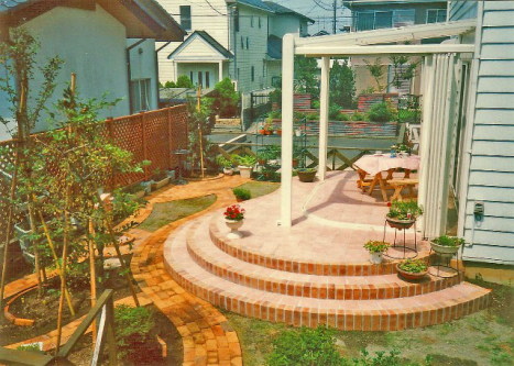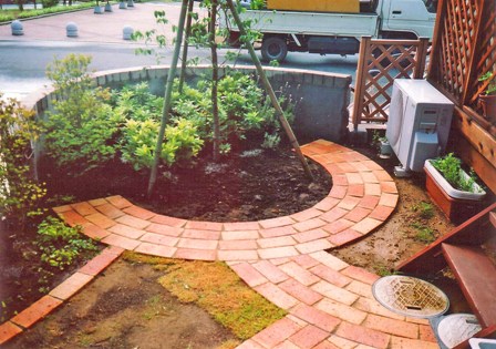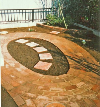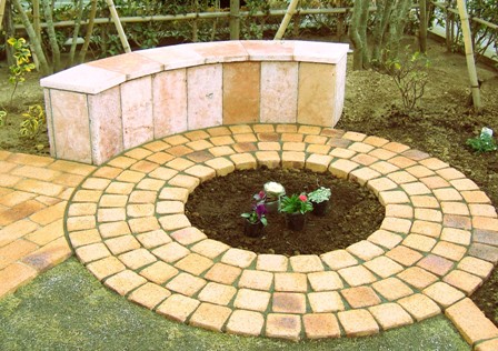 ![]() 円形のレンガ敷きテラス。その周りを6段積みのレンガで高くした。 |