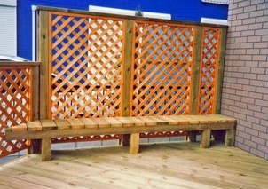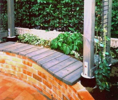 ![]() フェンス際に作り付けたベンチは、いこいの場所に。 |