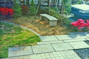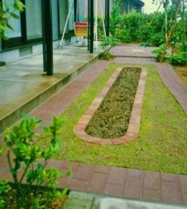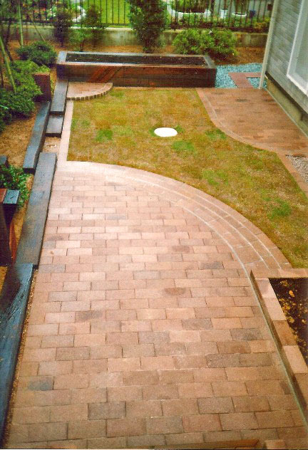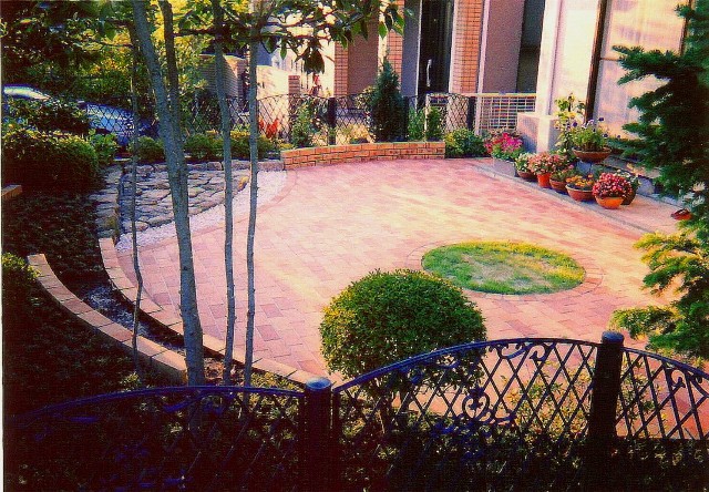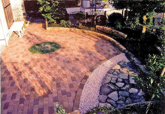 当初広い芝生の庭でしたが、手間のかからないシンプルな庭に改造したいとのご希望でした。円をモチーフにレンガ敷きとし、古い庭石を石畳として再利用しました。 |