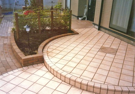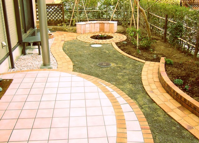![]() 曲線テラスの形状。レンガで縁取りし、タイル貼りにしている。 |