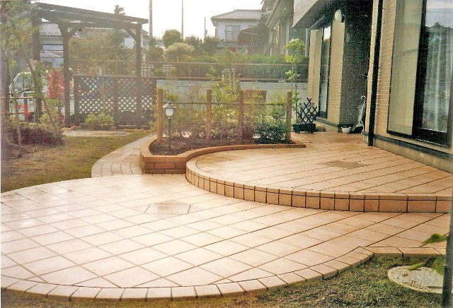 二つの円形テラスはタイル張りで、段差をつけることにより庭全体に違和感なく溶け込んでいます。花壇やパーゴラ等でさらに立体的なボリューム感を表現しています。 |