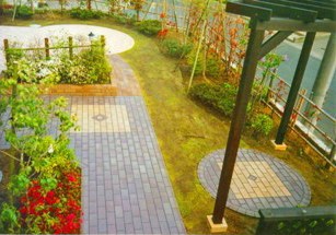 円形のレンガ壁に囲まれたプライベートな性格の庭です。緑や四季の草花に囲まれた中を車椅子で移動しながら、療養の励みとなるように作られた「いやし」の空間です。 |